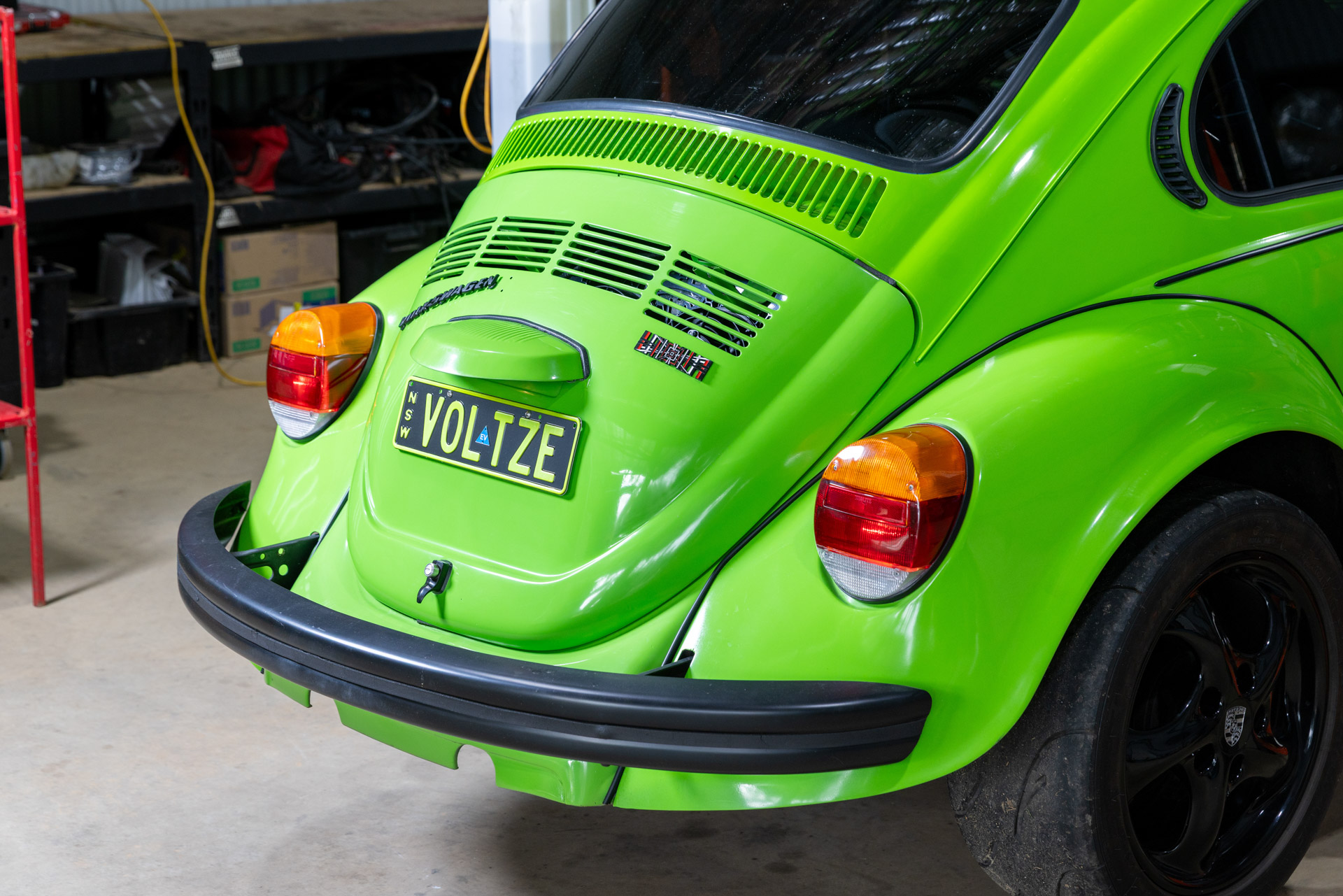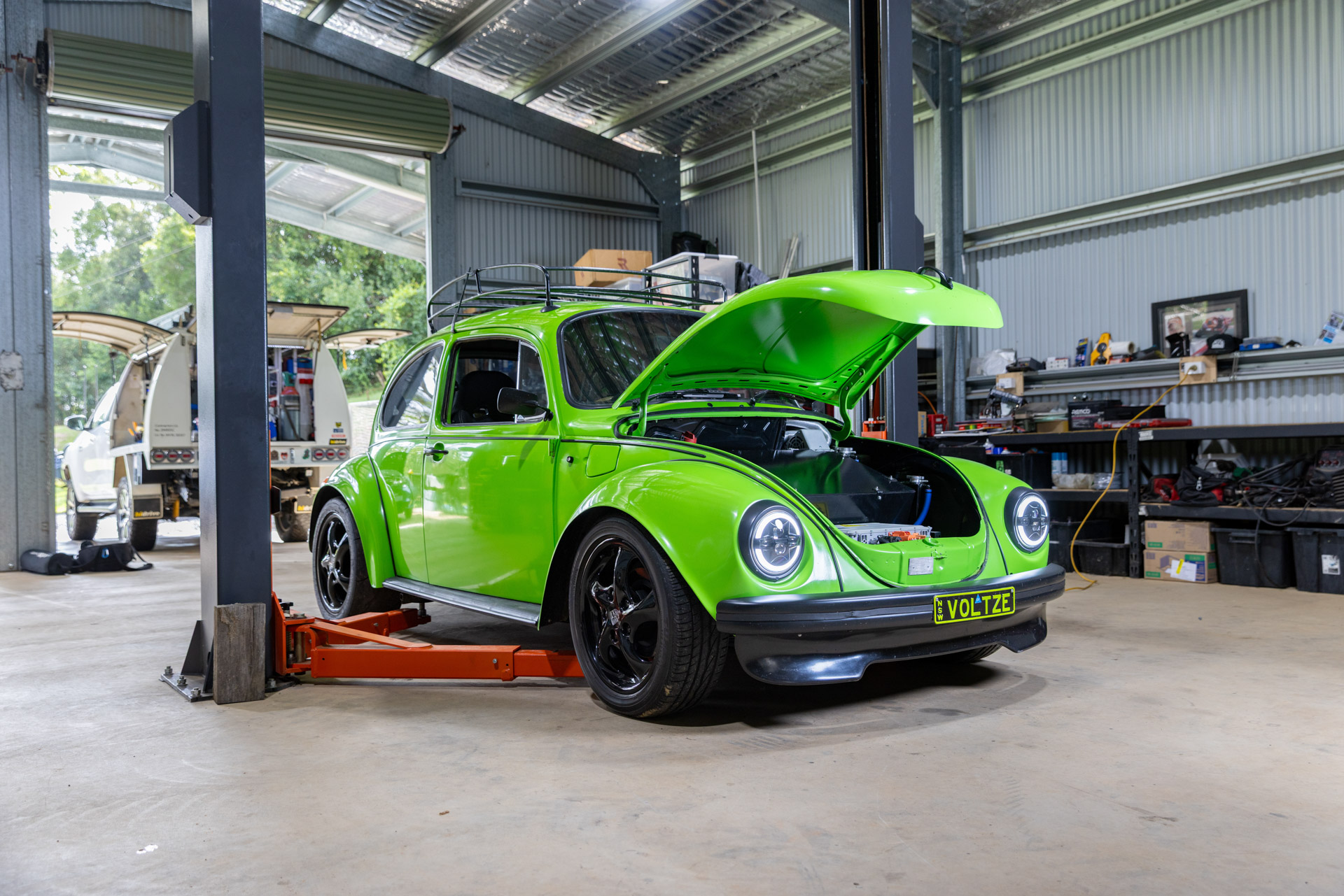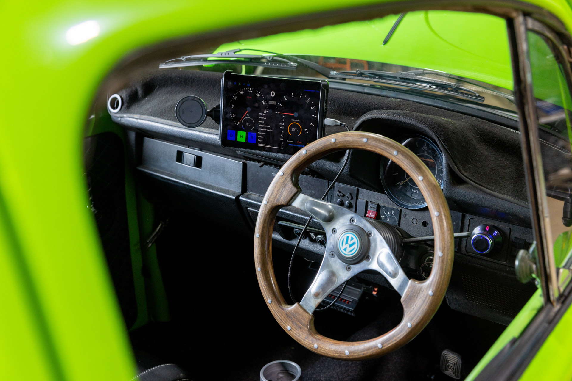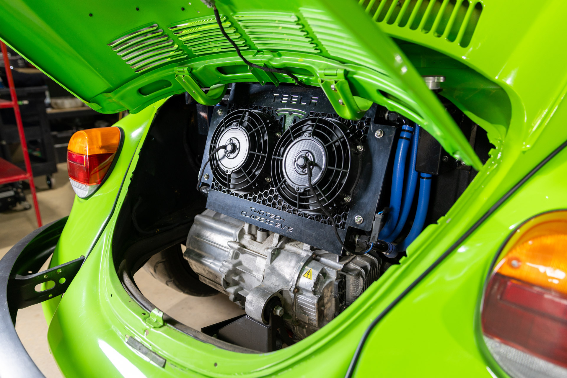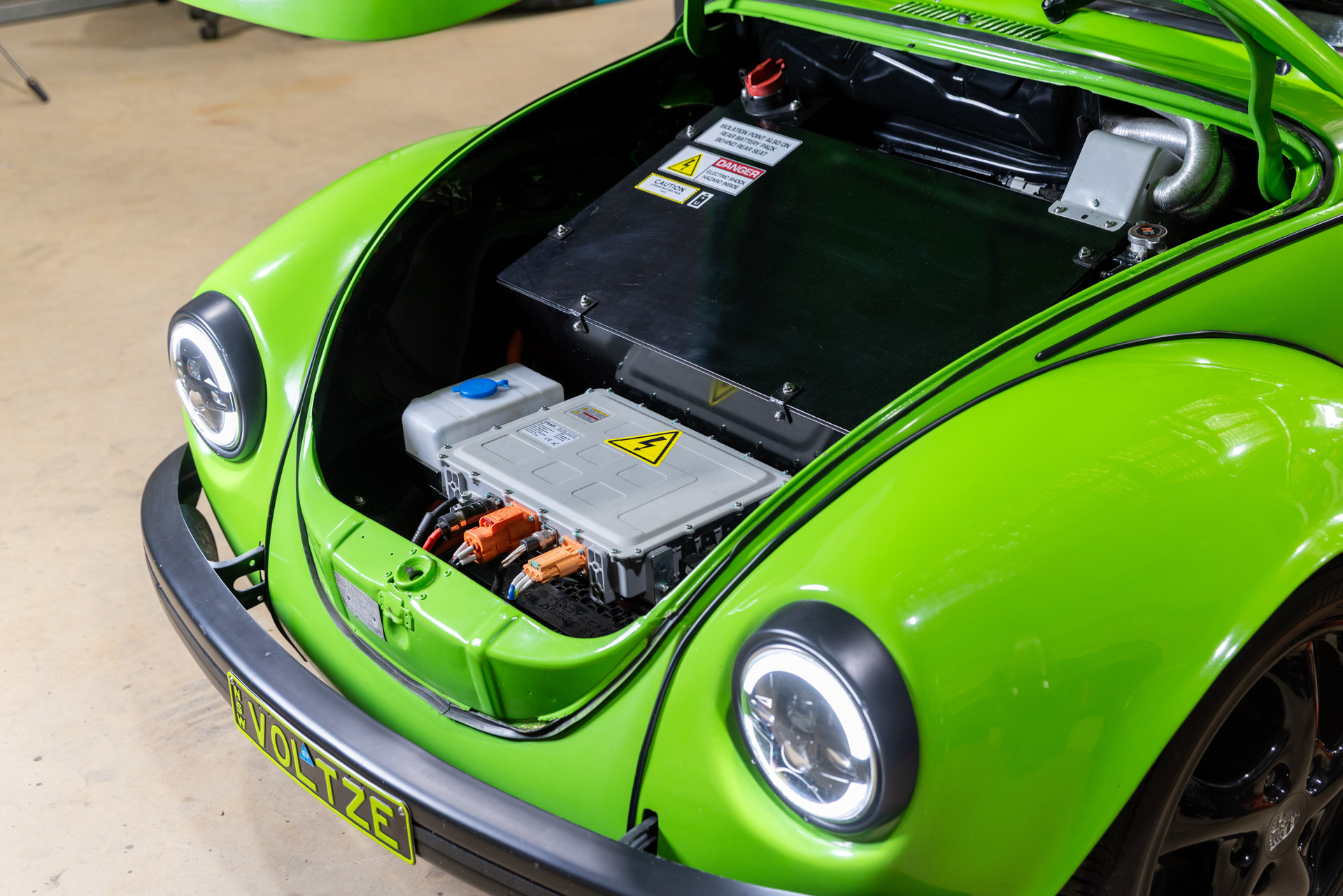 Tesla Model X SDU rear motor Water cooled via 12v water pump and 12 v fan through radiator rear driver side. Temperature controlled through T2C motor controller. Quaife LSD diff inside Tesla SDU. Direct drive from Tesla axles to VW CV joints at stub axle end (Type 3 CV’s) motor at 40% output. New Porsche 930 CV kit to go in soon to allow 100% power output. No gear box. No gears just forward and reverse dial on dash EV Controls T2C Tesla motor controller that communicates via CAN and Blue toothed to iPad display. No traction control at this stage.